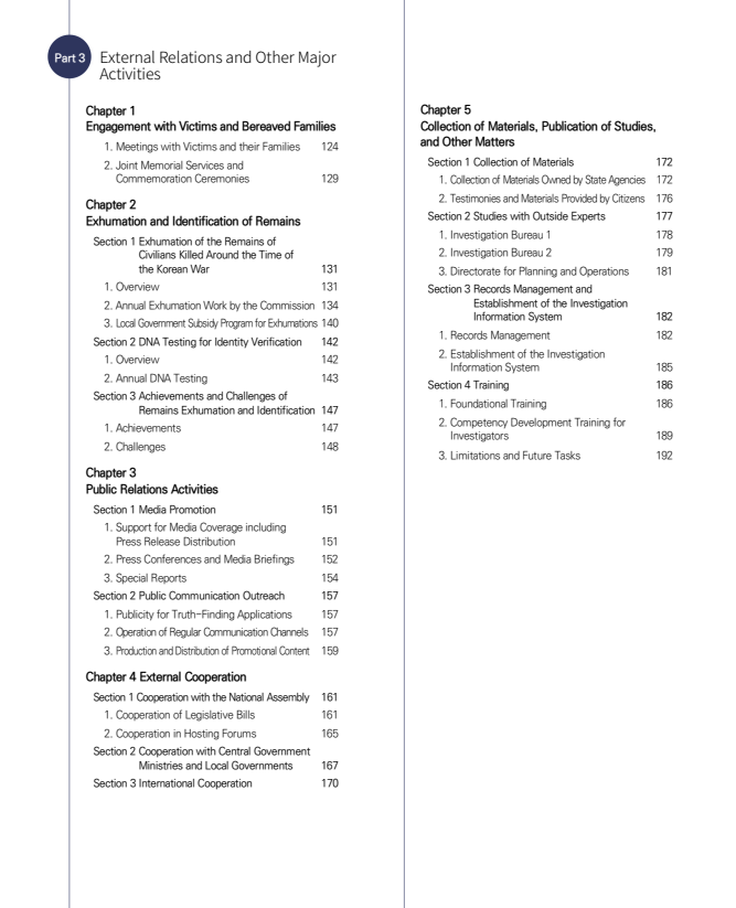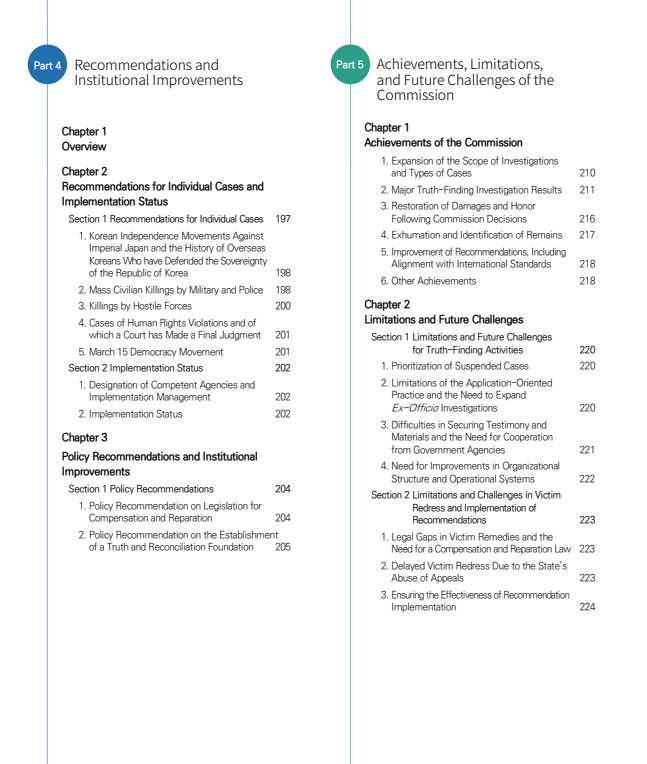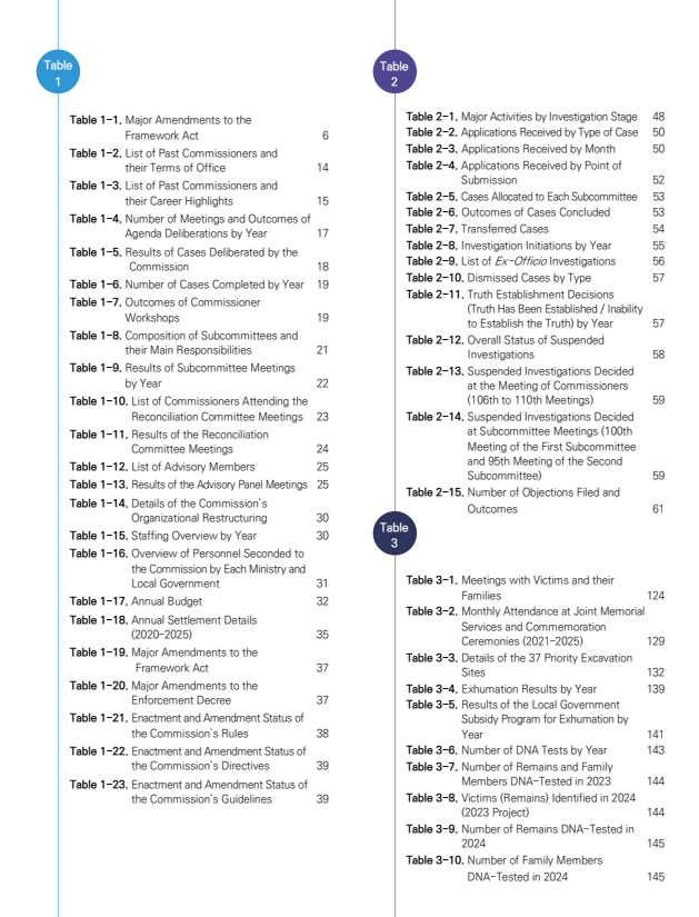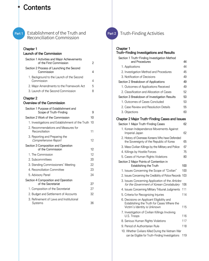 The Comprehensive Report consists of four separate volumes. Volume 1, the General Overview, outlines the background and legal basis of the Commission’s establishment, as well as its overall investigative activities and outcomes. Volume 2 addresses cases related to Independence Movements against Imperial Japan and Civilian Massacres around the Time of the Korean War, while Volume 3 examines cases involving Human Rights Violations during the Period of Authoritarian Rule. In addition, a separate volume is dedicated to the March 15 Democracy Movement.